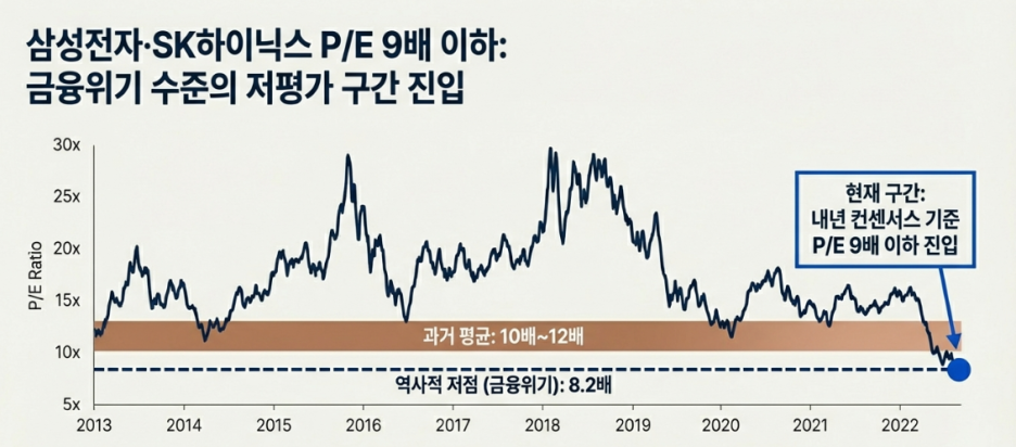 ➡️ 금융위기 당시의 바닥 PER이 8.23배였음을 상기하면 지금은 명백한 '심리적 과매도' 구간.