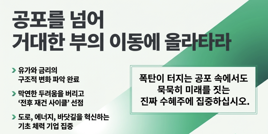 ➡️ 유가 폭등과 지수 하락으로 투자자들의 공포가 극에 달한 지금, 냉철한 '똑똑한 큰손'들은 이미 전쟁 이후의 경제 질서와 재건 사이클을 계산하며 '평화 배당금'을 챙길 준비를 시작했습니다.