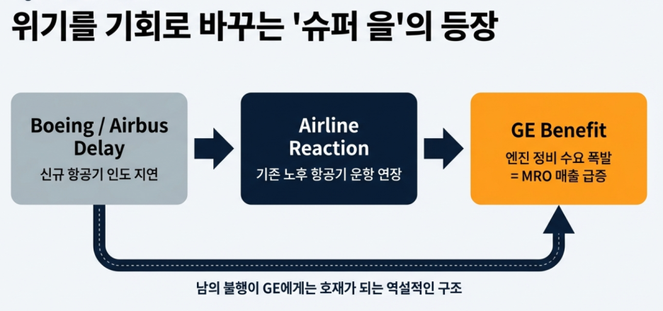 비행기가 낡을수록 엔진 정비 주기는 짧아지고, GE의 고수익 부품 수요는 폭증.