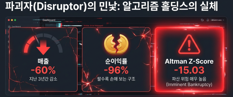 알트만 Z-스코어 -15.03 기록. 당장 파산해도 이상하지 않을 '돈 태우기'식 경영의 한계가 드러남.